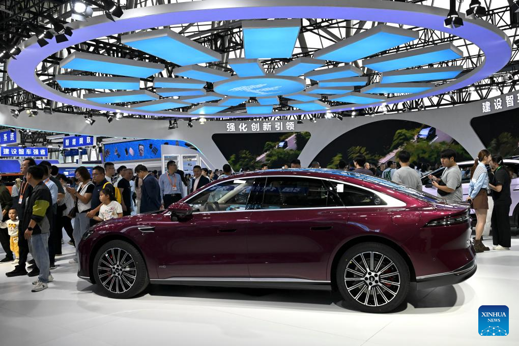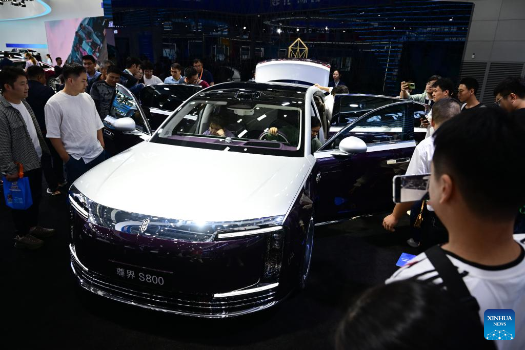 People visit the ICV (Internet-connected vehicles) and NEV (new energy vehicles) Exhibition Area of the 2025 World Manufacturing Convention (WMC) in Hefei, east China's Anhui Province, Sept. 20, 2025. Themed "Intelligent Manufacturing For a Better Future", the 2025 WMC kicked off here on Saturday. (Xinhua/Huang Bohan)