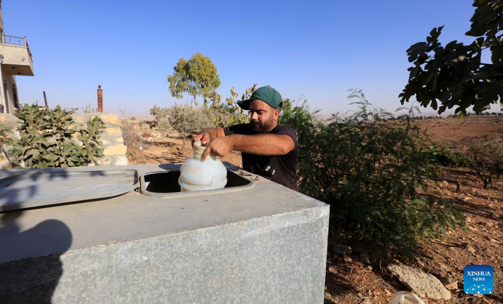 A man gets water from a water tank at a village in Jerash, Jordan, on Sept. 20, 2025. Jordan is grappling with one of the world's most severe water crises caused by climate change, over-pumping, and rising demand, as local authorities are trying to manage scarcity with a rotation system and large-scale infrastructure projects.(Photo by Mohammad Abu Ghosh/Xinhua)