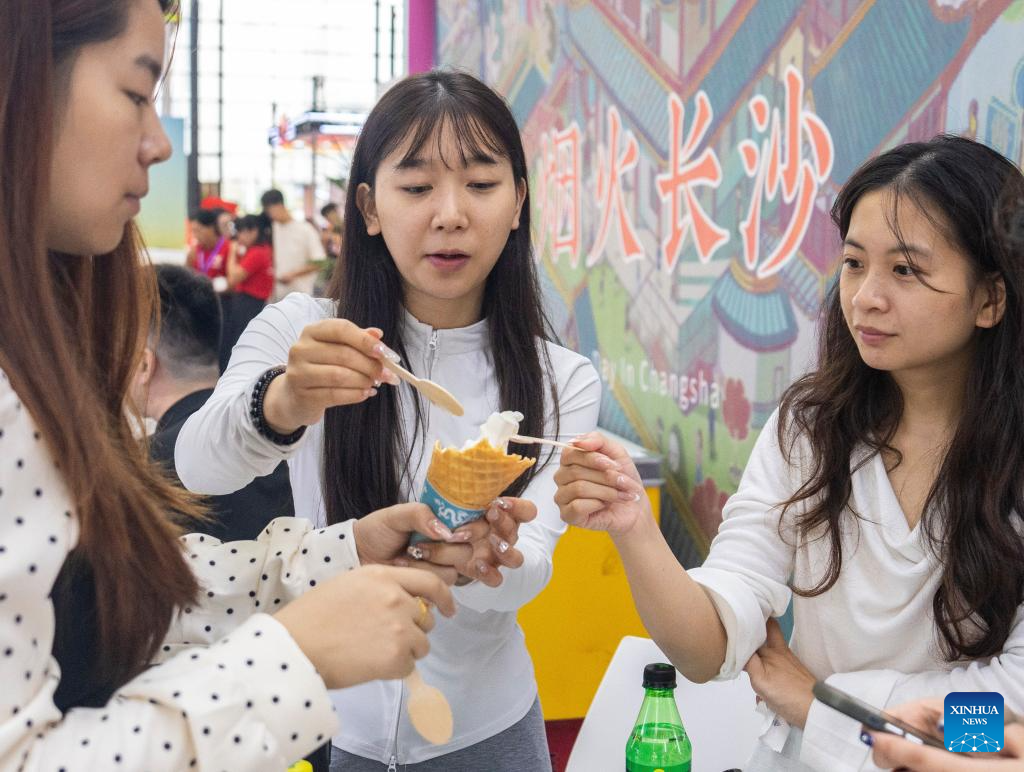 Visitors taste an ice cream at the 10th China International Food & Catering Expo in Changsha, central China's Hunan Province, Sept. 19, 2025. The 10th China International Food & Catering Expo opened here on Friday, attracting over 1,400 enterprises to participate. (Xinhua/Chen Sihan)