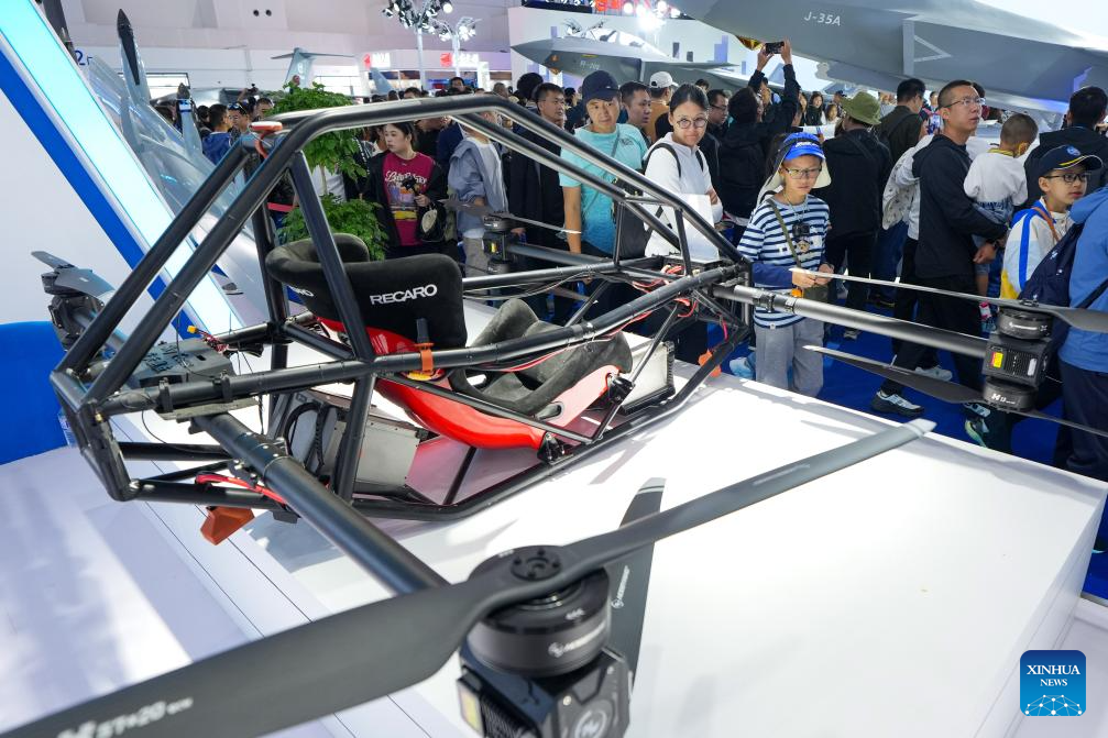 Visitors view a manned electric vertical take-off and landing aircraft during the 2025 aviation open-day activities of the Chinese People's Liberation Army (PLA) Air Force and Changchun Air Show in Changchun, northeast China's Jilin Province, Sept. 20, 2025. The event is held here from Sept. 19 to 23, which comprehensively showcases the history and modernization of the PLA Air Force through aerobatic performances, equipment exhibitions, and various interactive activities. (Xinhua/Xu Chang)