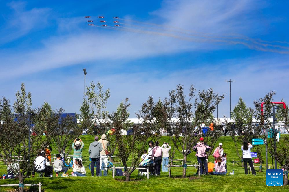 Visitors enjoy an aerobatic performance during the 2025 aviation open-day activities of the Chinese People's Liberation Army (PLA) Air Force and Changchun Air Show in Changchun, northeast China's Jilin Province, Sept. 20, 2025. The event is held here from Sept. 19 to 23, which comprehensively showcases the history and modernization of the PLA Air Force through aerobatic performances, equipment exhibitions, and various interactive activities. (Xinhua/Xu Chang)