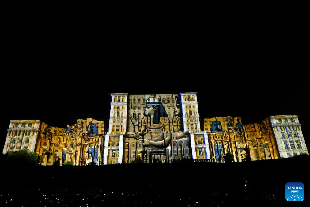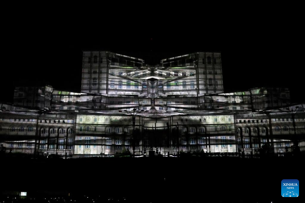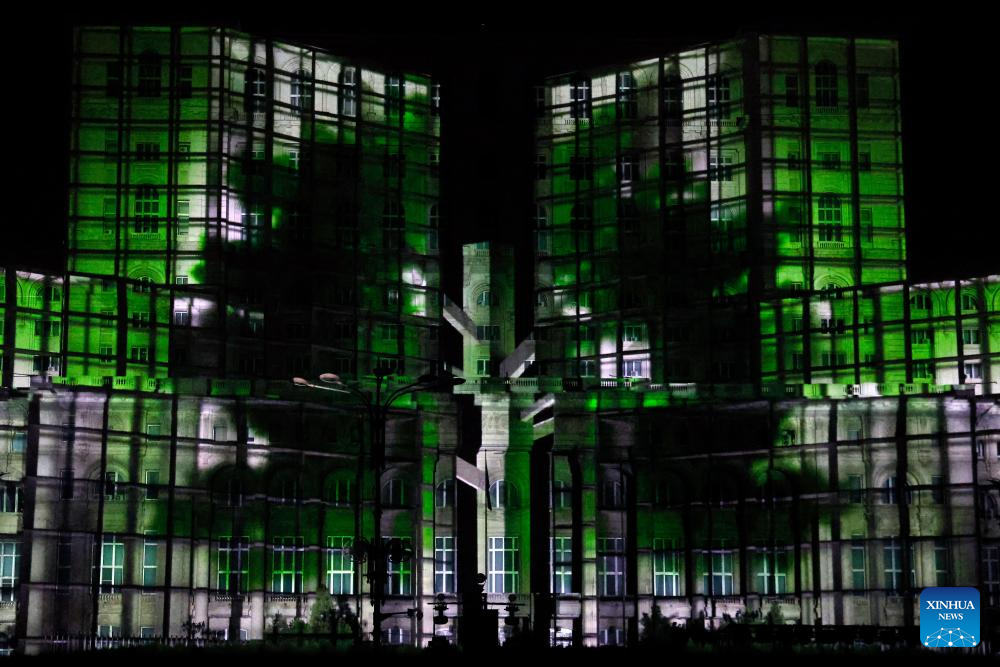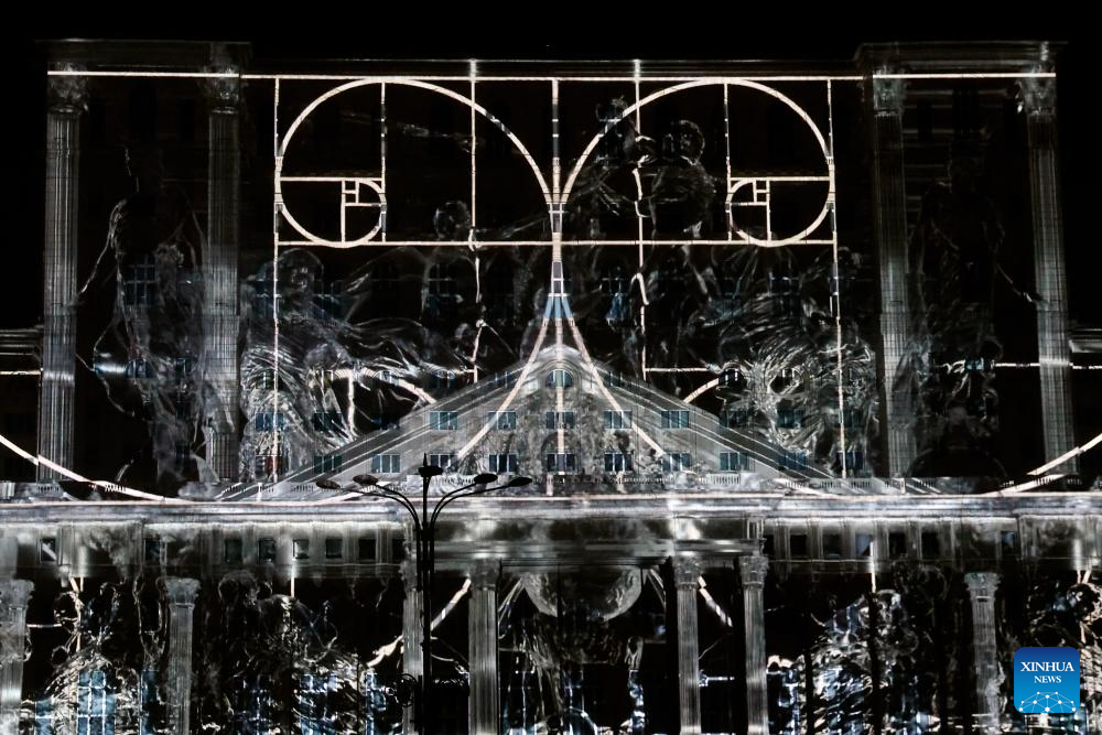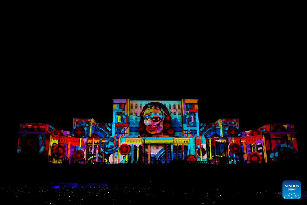 A 3D projection is seen during the iMapp Bucharest 2025, on the facade of the Parliament Palace, in Bucharest, Romania, Sept. 20, 2025. (Photo by Cristian Cristel/Xinhua)