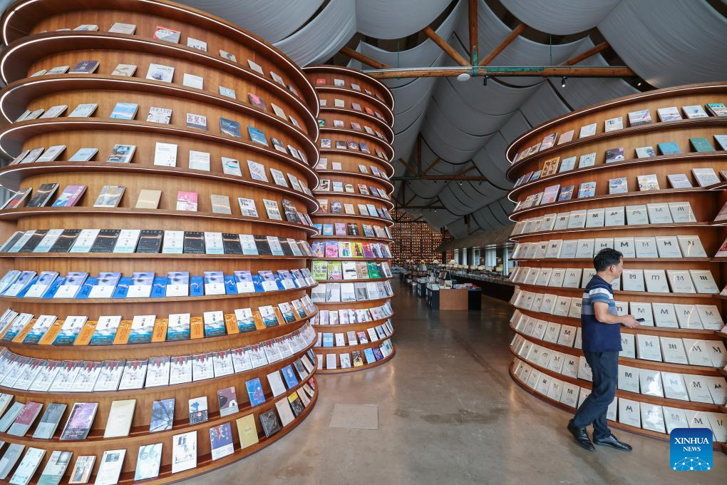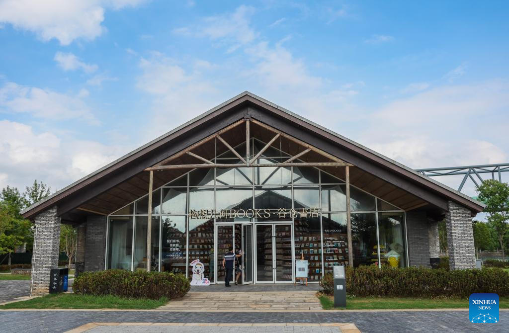 This photo taken on Sept. 19, 2025 shows a bookstore in a barn-modified cultural industrial park in Shendang Town in Haiyan County, Jiaxing City, east China's Zhejiang Province. Shendang Town has been developing a distinctive cultural and tourism route with its own features, making the town a highly sought-after tourist destination in the Yangtze River Delta region since 2024. It has integrated its most distinctive culture, intangible cultural heritages, landmarks, and surrounding cultural tourism projects with the characteristics of the town, offering visitors exceptional cultural and tourism experiences.