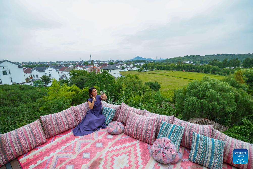 A tourist poses for a selfie at a rural scenic spot in Haiyan County of Jiaxing City, east China's Zhejiang Province, on Sept. 20, 2025. Shendang Town has been developing a distinctive cultural and tourism route with its own features, making the town a highly sought-after tourist destination in the Yangtze River Delta region since 2024. It has integrated its most distinctive culture, intangible cultural heritages, landmarks, and surrounding cultural tourism projects with the characteristics of the town, offering visitors exceptional cultural and tourism experiences.