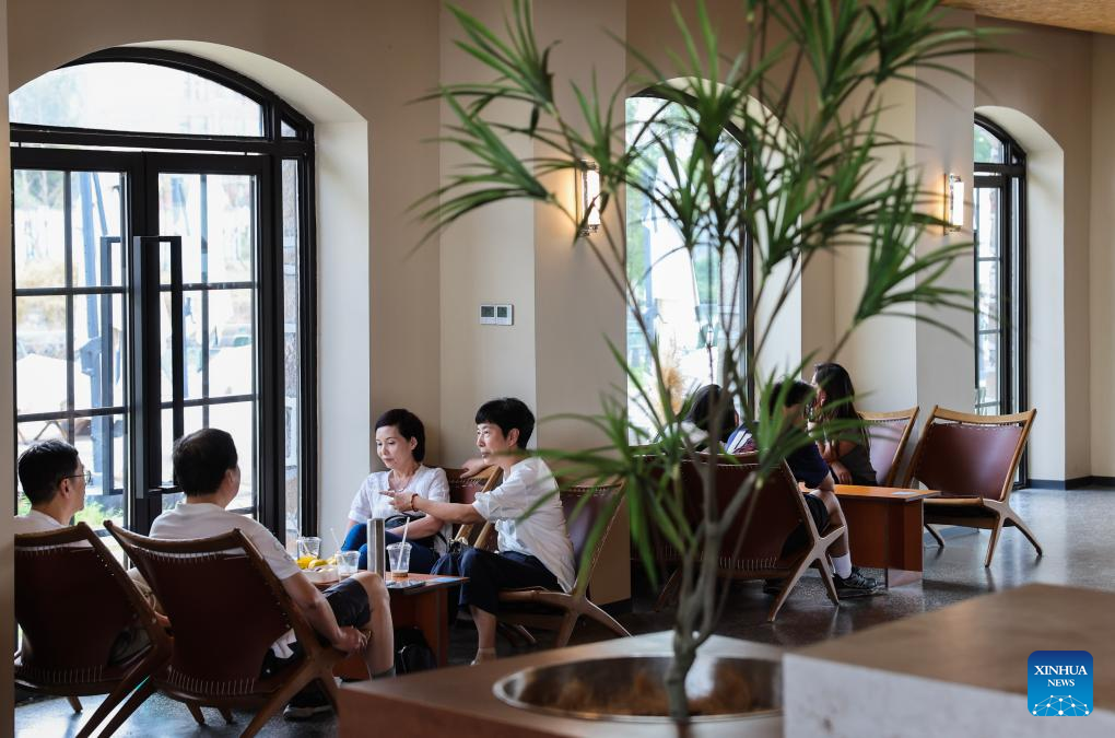 Tourists take a rest at a cafe in a barn-modified cultural industrial park in Shendang Town in Haiyan County, Jiaxing City, east China's Zhejiang Province, Sept. 19, 2025. Shendang Town has been developing a distinctive cultural and tourism route with its own features, making the town a highly sought-after tourist destination in the Yangtze River Delta region since 2024. It has integrated its most distinctive culture, intangible cultural heritages, landmarks, and surrounding cultural tourism projects with the characteristics of the town, offering visitors exceptional cultural and tourism experiences.