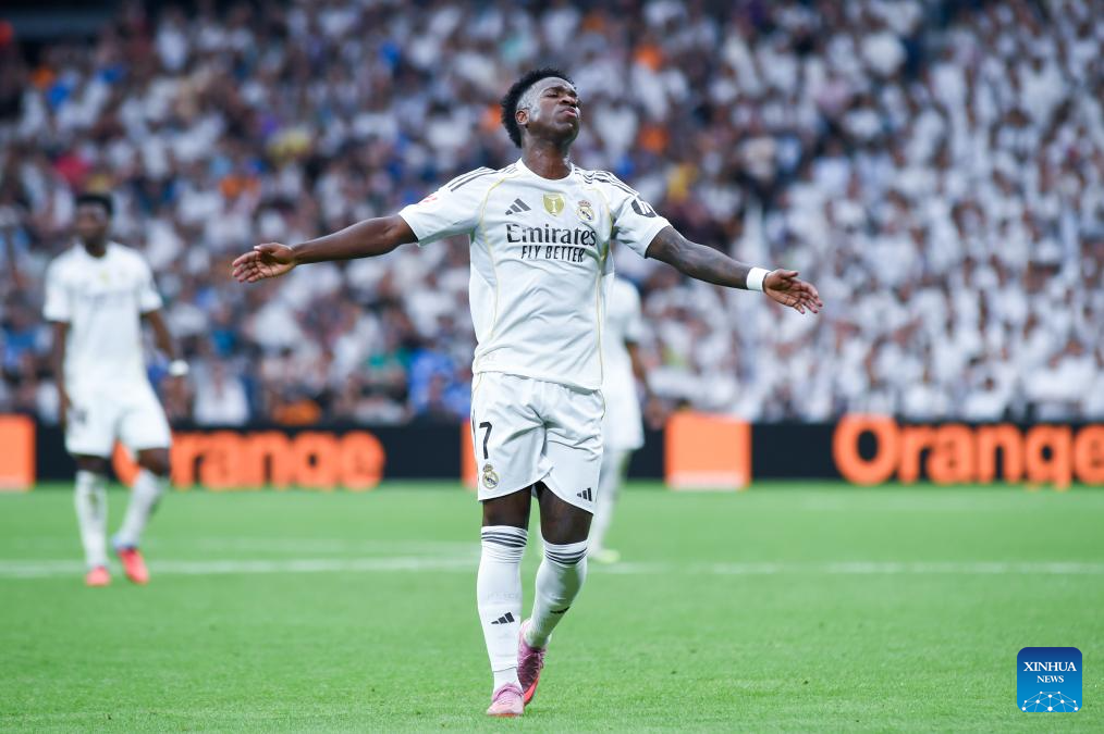 Vinicius Junior of Real Madrid reacts during the La Liga football match between Real Madrid and RCD Espanyol in Santiago Bernabeu Stadium, Madrid, Spain, Sept. 20, 2025. (Photo by Gustavo Valiente/Xinhua)