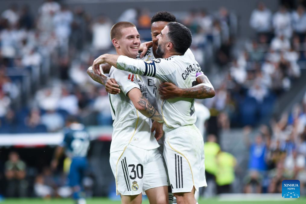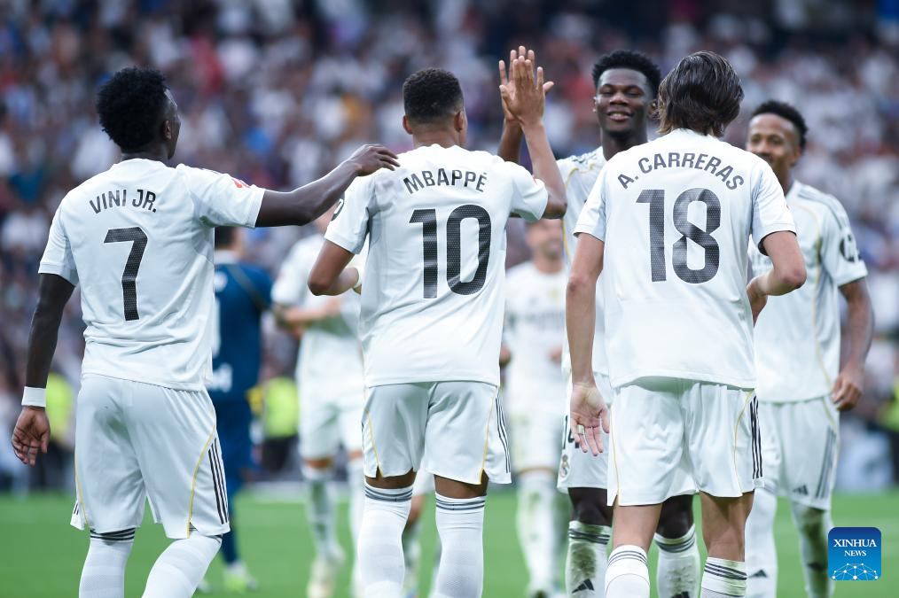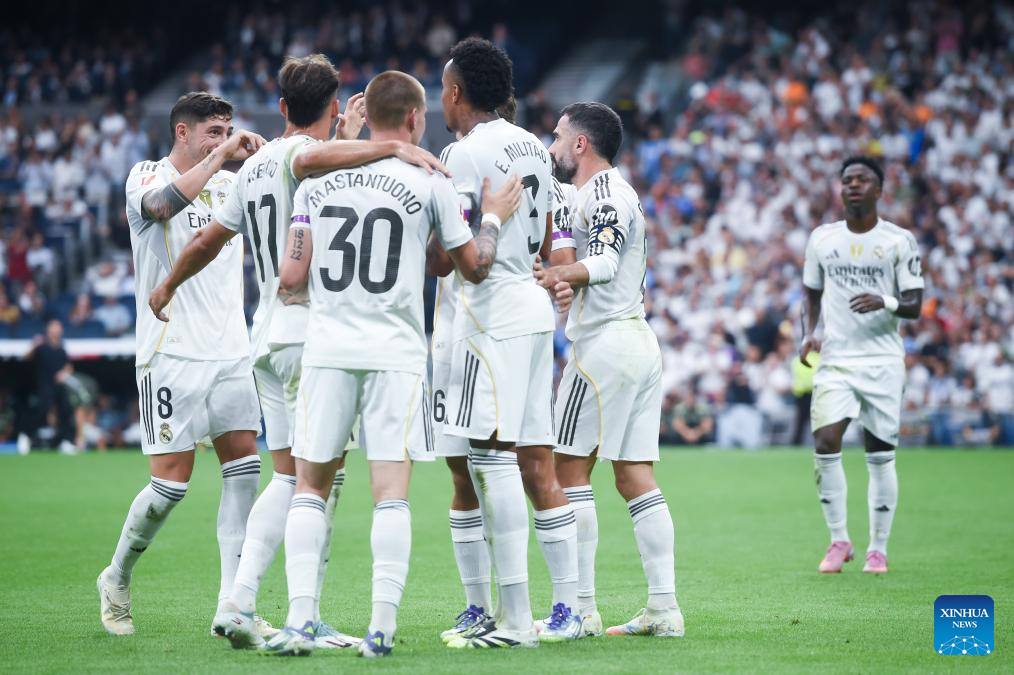 Players of Real Madrid celebrate a goal during the La Liga football match between Real Madrid and RCD Espanyol in Santiago Bernabeu Stadium, Madrid, Spain, Sept. 20, 2025. (Photo by Gustavo Valiente/Xinhua)