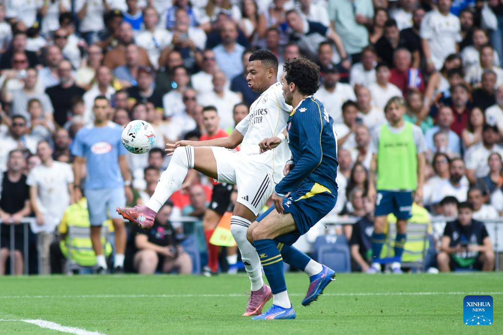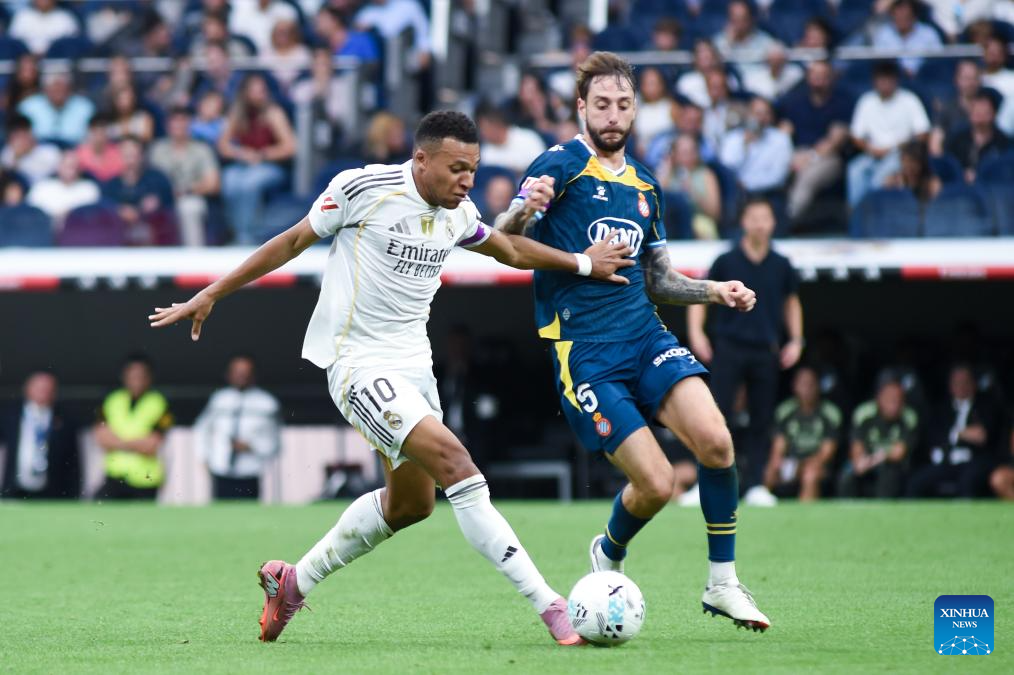 Kylian Mbappe (L) of Real Madrid vies with Fernando Calero of RCD Espanyol during the La Liga football match between Real Madrid and RCD Espanyol in Santiago Bernabeu Stadium, Madrid, Spain, Sept. 20, 2025. (Photo by Gustavo Valiente/Xinhua)
