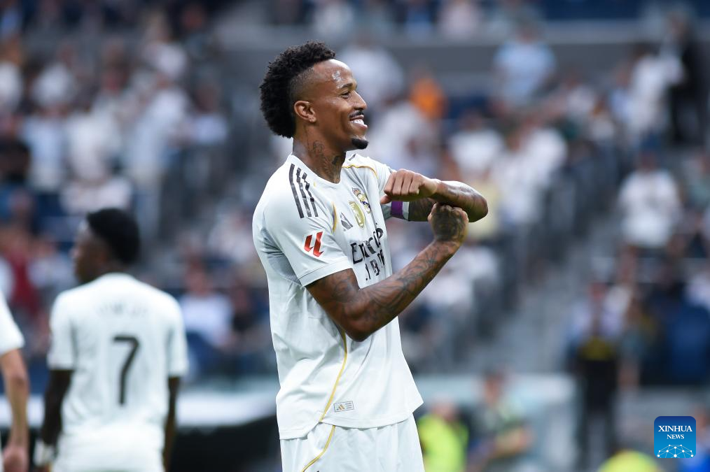Eder Militao of Real Madrid celebrates a goal during the La Liga football match between Real Madrid and RCD Espanyol in Santiago Bernabeu Stadium, Madrid, Spain, Sept. 20, 2025. (Photo by Gustavo Valiente/Xinhua)