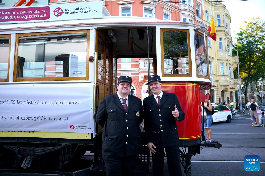 People take a historical tram during a tram parade in Prague, the Czech Republic, on Sept. 21, 2025. A tram parade was held here on Sunday as part of the celebrations to mark 150 years of urban public transport in the Czech capital. (Photo by Dana Kesnerova/Xinhua)