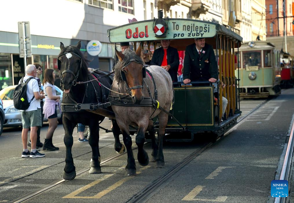 This photo taken on Sept. 21, 2025 shows a historical horse-drawn tram during a tram parade in Prague, the Czech Republic. A tram parade was held here on Sunday as part of the celebrations to mark 150 years of urban public transport in the Czech capital. (Photo by Dana Kesnerova/Xinhua)