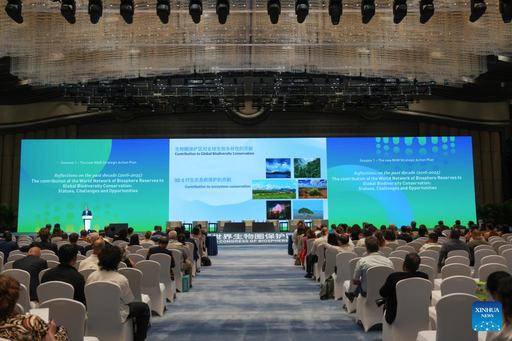 Representatives attend an event during the 5th World Congress of Biosphere Reserves in Hangzhou, east China's Zhejiang Province, Sept. 22, 2025. The 5th World Congress of Biosphere Reserves kicked off here on Monday and will last till Sept. 25. (Xinhua/Huang Zongzhi)