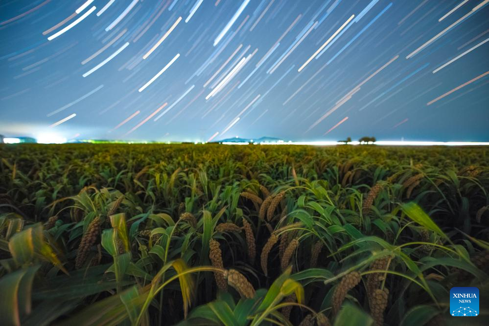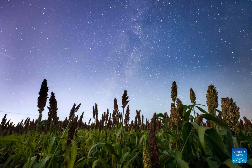 This photo taken on Sept. 22, 2025 shows a sorghum field under the starry sky in Qiqihar City, northeast China's Heilongjiang Province. (Photo by Wang Yonggang/Xinhua)
