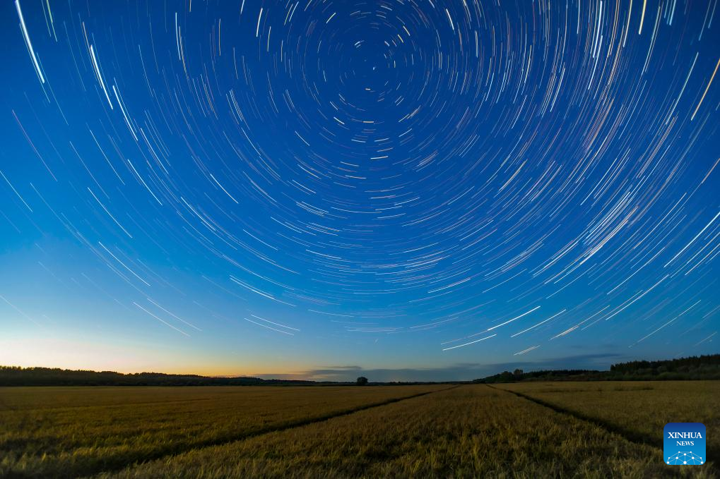 This stack composite photo taken on Sept. 17, 2025 shows a field under the starry sky in Fujin City, northeast China's Heilongjiang Province. (Photo by Qu Yubao/Xinhua)
