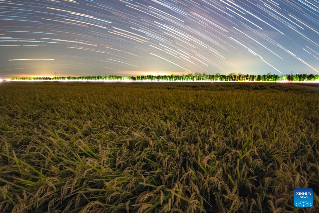 This stack composite photo taken on Sept. 17, 2025 shows rice paddies under the starry sky in Fujin City, northeast China's Heilongjiang Province. (Photo by Qu Yubao/Xinhua)