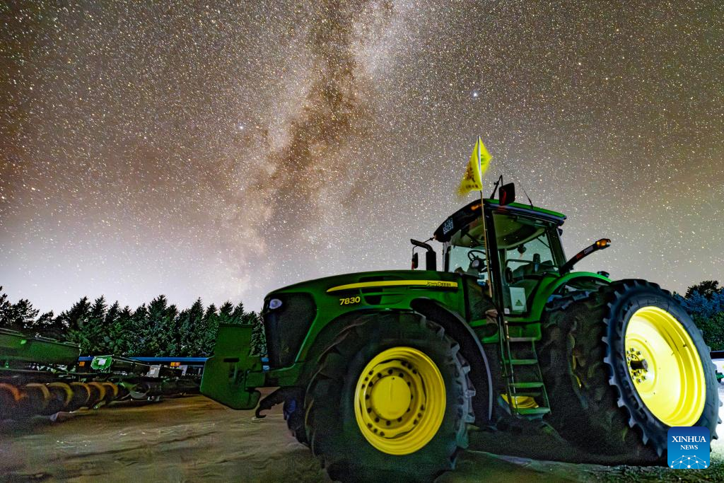 This photo taken on Sept. 19, 2025 shows tractors under the starry sky at a farm under Beidahuang Group in northeast China's Heilongjiang Province. (Photo by Qian Boyu/Xinhua)