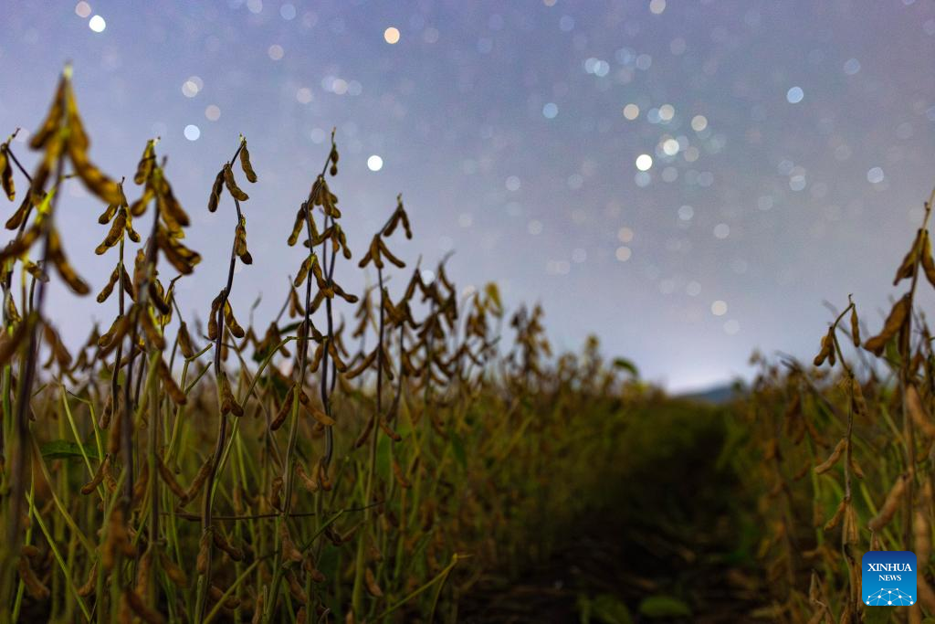 This photo taken on Sept. 17, 2025 shows a soybean field under the starry sky in Fujin City, northeast China's Heilongjiang Province. (Photo by Qu Yubao/Xinhua)