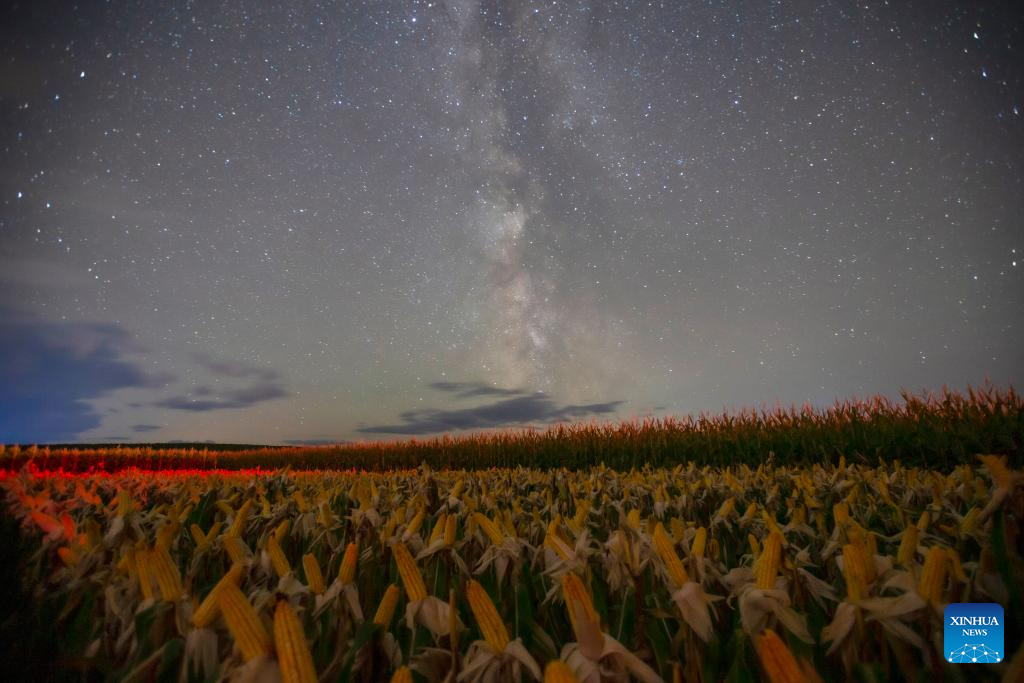 This photo taken on Sept. 21, 2025 shows a corn field under the starry sky in Jiayin County, northeast China's Heilongjiang Province. (Photo by Li Shaojun/Xinhua)