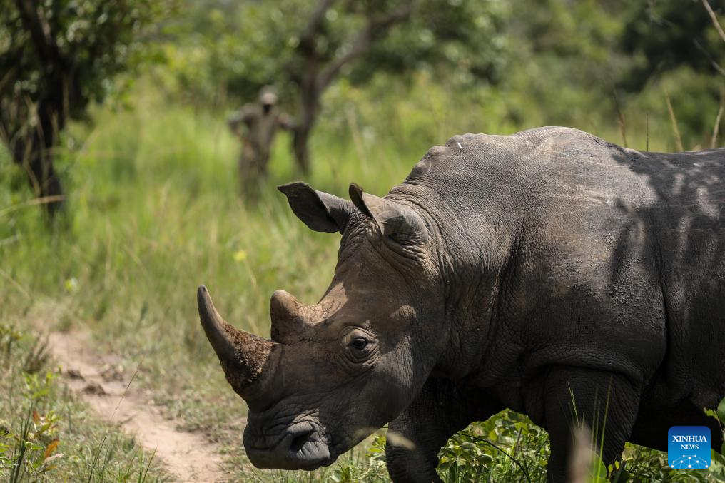 This photo taken on Sept. 22, 2025 shows a rhino at the Ziwa Rhino Sanctuary in Nakasongola, Uganda. Uganda on Monday held a special ceremony where 17 rhino calves were named at the Ziwa Rhino Sanctuary in the central district of Nakasongola as part of efforts to revive a species once extinct in the country. The naming ceremony, which coincided with World Rhino Day, allows individuals, corporations, and philanthropists to symbolically "adopt" and name a rhino, with the proceeds supporting habitat expansion, veterinary care, and conservation efforts. (Photo by Hajarah Nalwadda/Xinhua)