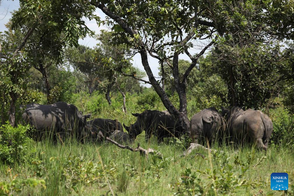This photo taken on Sept. 22, 2025 shows a group of rhinos at the Ziwa Rhino Sanctuary in Nakasongola, Uganda.
