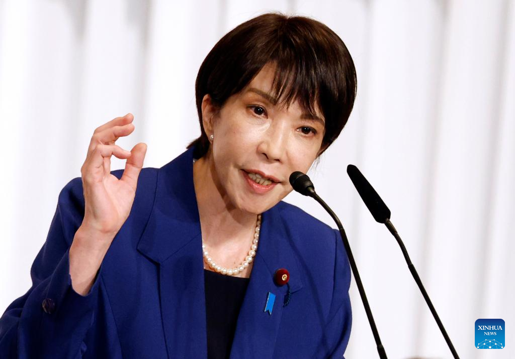 Former Economic Security Minister Sanae Takaichi speaks during a leadership election campaign of Liberal Democratic Party (LDP) in Tokyo, Japan, Sept. 22, 2025. Japan's ruling LDP officially launched its leadership election campaign on Monday, with five candidates filing their candidacies. (Franck Robichon/Pool via Xinhua)