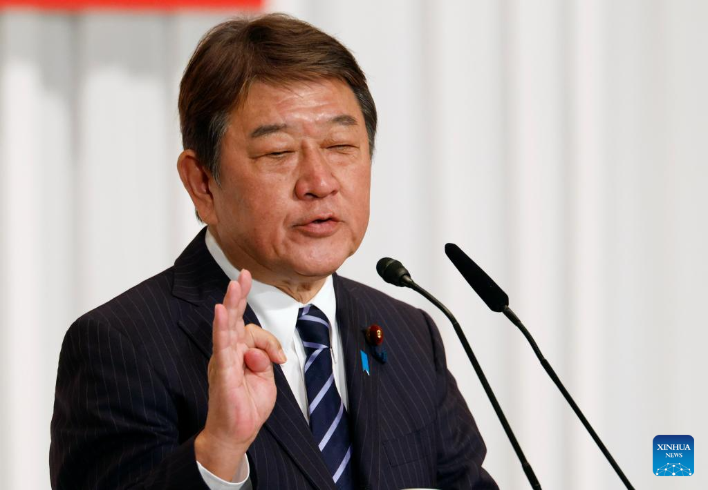 Former LDP Secretary-General Toshimitsu Motegi speaks during a leadership election campaign of Liberal Democratic Party (LDP) in Tokyo, Japan, Sept. 22, 2025. Japan's ruling LDP officially launched its leadership election campaign on Monday, with five candidates filing their candidacies. (Franck Robichon/Pool via Xinhua)