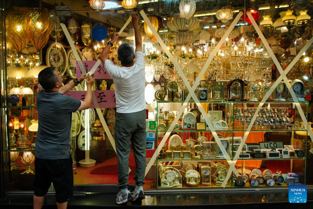 Staff members stick adhesive strips on the glass of a store in Hong Kong, south China, Sept. 22, 2025. The Emergency Monitoring and Support Center under the Security Bureau of China's Hong Kong Special Administrative Region (HKSAR) government was activated on Monday morning in preparation for typhoon Ragasa. (Xinhua/Zhu Wei)