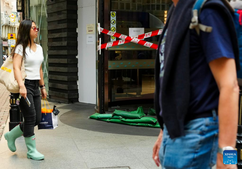 This photo shows the flood control sandbags in front of a hotel in Hong Kong, south China, Sept. 22, 2025. The Emergency Monitoring and Support Center under the Security Bureau of China's Hong Kong Special Administrative Region (HKSAR) government was activated on Monday morning in preparation for typhoon Ragasa. (Xinhua/Zhu Wei)