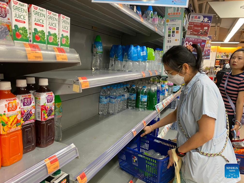 People shop at a supermarket in Hong Kong, south China, Sept. 22, 2025. The Emergency Monitoring and Support Center under the Security Bureau of China's Hong Kong Special Administrative Region (HKSAR) government was activated on Monday morning in preparation for typhoon Ragasa. (Xinhua/Zhu Wei)