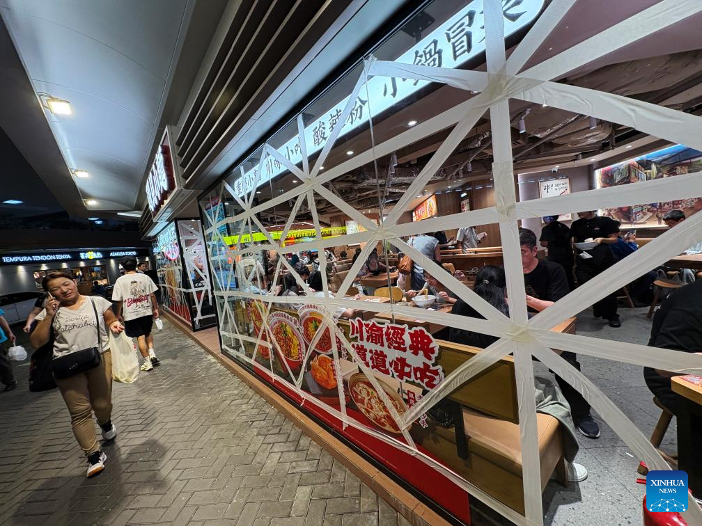 This photo taken on Sept. 22, 2025 shows adhesive strips on the glass of a restaurant in Hong Kong, south China. The Emergency Monitoring and Support Center under the Security Bureau of China's Hong Kong Special Administrative Region (HKSAR) government was activated on Monday morning in preparation for typhoon Ragasa. (Photo by Wang Shen/Xinhua)