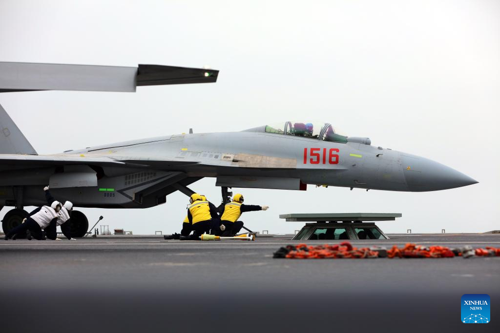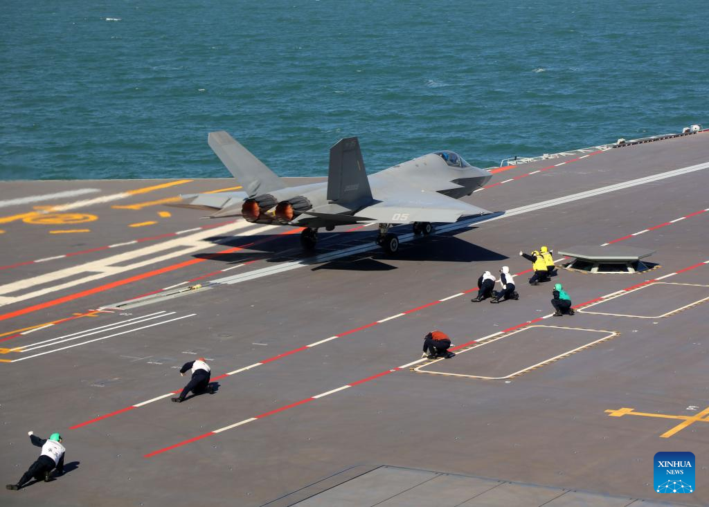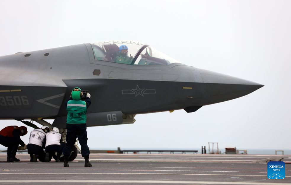 This file photo shows a carrier-based aircraft J-35 during a training on China's aircraft carrier Fujian. (Photo by Li Tang/Xinhua)