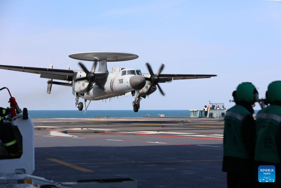 This file photo shows a carrier-based aircraft KongJing-600 making an arrested landing on China's aircraft carrier Fujian. (Photo by Lyu Zhihao/Xinhua)