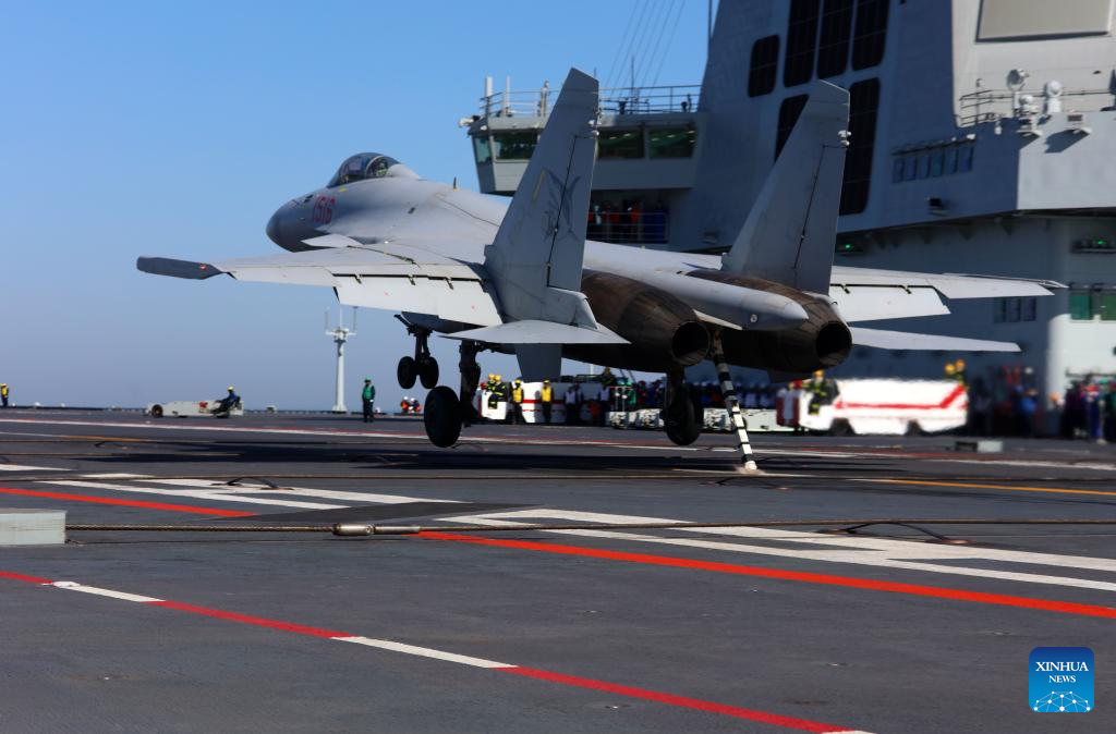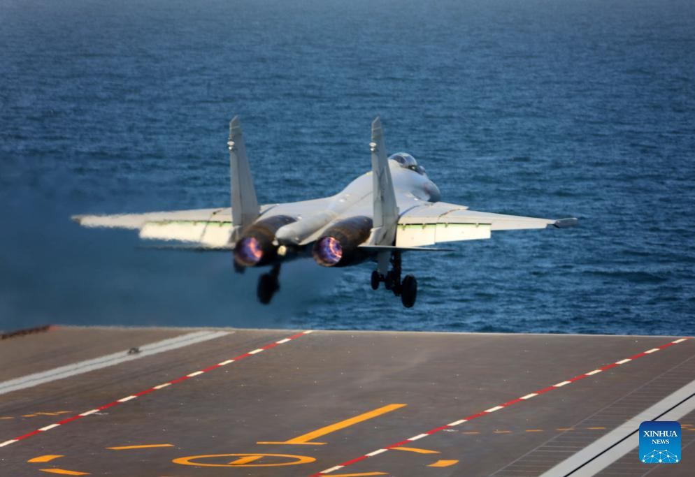 BEIJING, Sept. 22 (Xinhua) -- The Chinese Navy said Monday that carrier-based aircraft J-15T, J-35 and KongJing-600 have successfully completed their inaugural electromagnetic catapult-assisted takeoff and arrested landing trainings on aircraft carrier, the Fujian.