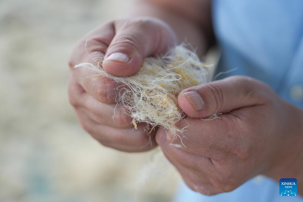 A worker checks the product quality at a fiber degumming workshop of a garment company in Yuli County, northwest China's Xinjiang Uygur Autonomous Region, Sept. 20, 2025. Leveraging apocynum venetum's characteristics of drought resistance, salt and alkali tolerance, cold and heat resistance, wind and sand resistance, and strong ecological adaptability, local authorities of Yuli County, which is located on the edge of the Taklimakan Desert, have made efforts to curb desertification, promote employment and increase local people's income by developing the apocynum venetum industry. (Photo by Wang Zhipeng/Xinhua)