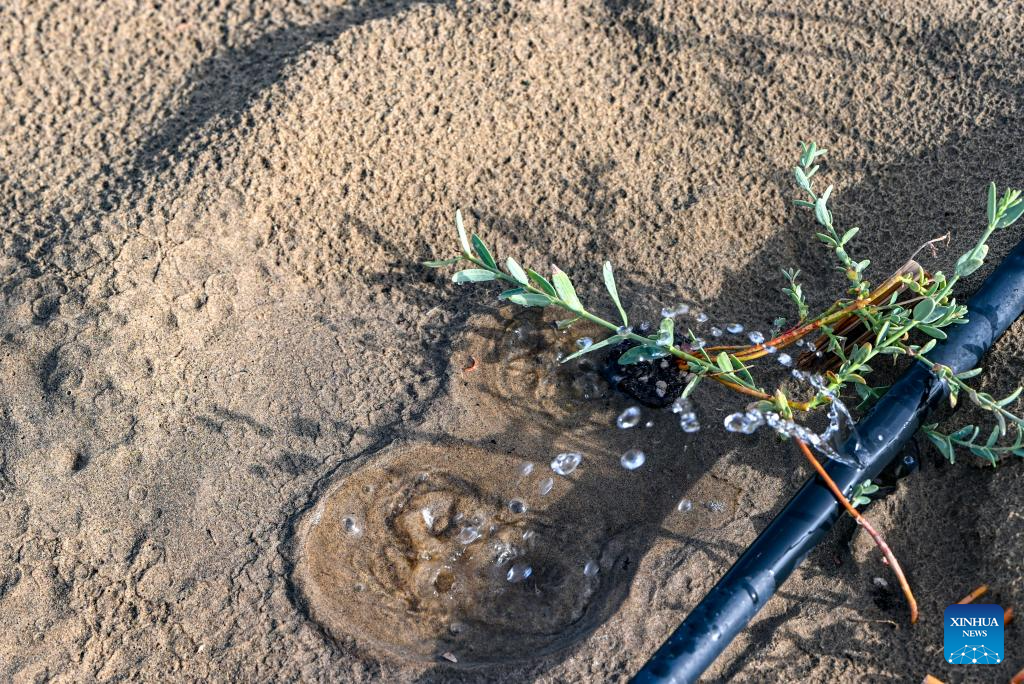 This photo taken on Sept. 20, 2025 shows the apocynum venetum irrigated by drip irrigation at the desert prevention and control area on the south bank of the Tarim River in Yuli County, northwest China's Xinjiang Uygur Autonomous Region. Leveraging apocynum venetum's characteristics of drought resistance, salt and alkali tolerance, cold and heat resistance, wind and sand resistance, and strong ecological adaptability, local authorities of Yuli County, which is located on the edge of the Taklimakan Desert, have made efforts to curb desertification, promote employment and increase local people's income by developing the apocynum venetum industry. (Xinhua/Chen Shuo)