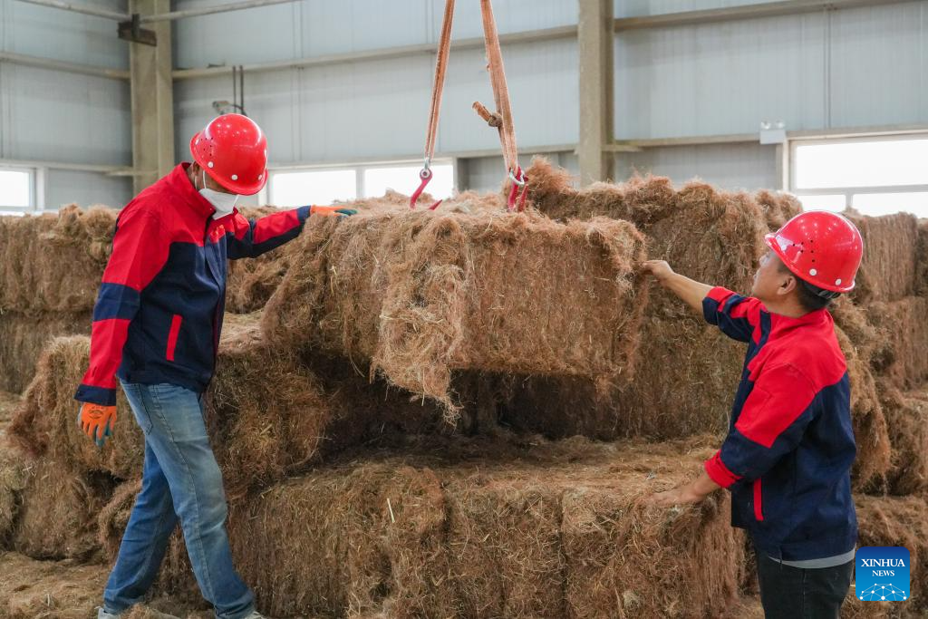 Workers transfer raw materials at a fiber degumming workshop of a garment company in Yuli County, northwest China's Xinjiang Uygur Autonomous Region, Sept. 20, 2025. Leveraging apocynum venetum's characteristics of drought resistance, salt and alkali tolerance, cold and heat resistance, wind and sand resistance, and strong ecological adaptability, local authorities of Yuli County, which is located on the edge of the Taklimakan Desert, have made efforts to curb desertification, promote employment and increase local people's income by developing the apocynum venetum industry. (Photo by Wang Zhipeng/Xinhua)