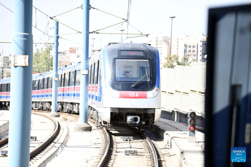 A metro train pulls into a station along the metro Line 1 in the northwestern city of Tabriz, Iran, on Sept. 17, 2025. With a total length of 17.2 km, the metro Line 1 in Tabriz has 18 stations. (Xinhua/Shadati)
