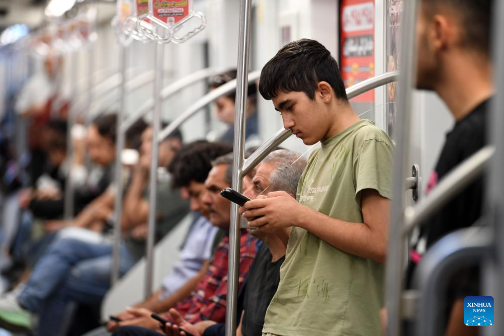 Passengers are seen on the metro Line 1 in the northwestern city of Tabriz, Iran, on Sept. 17, 2025. With a total length of 17.2 km, the metro Line 1 in Tabriz has 18 stations. (Xinhua/Shadati)