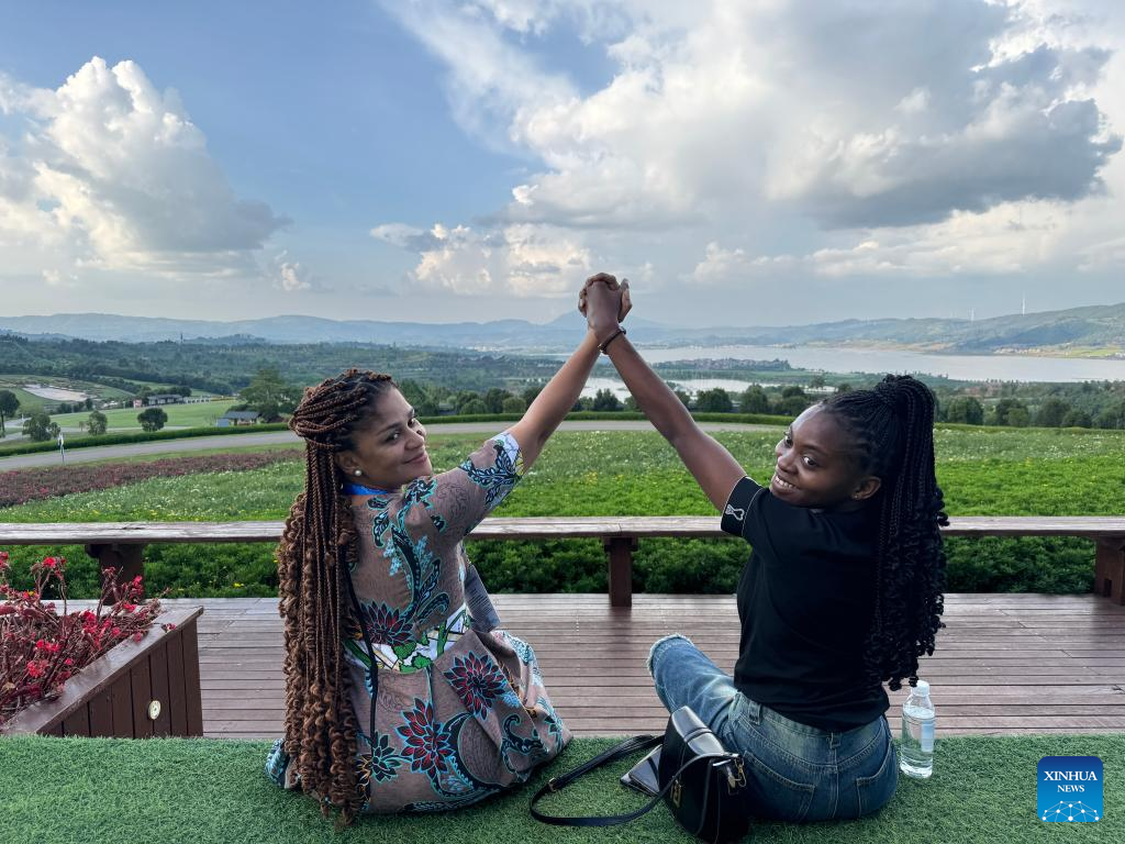 Milagrosa Ada Micha Abeso (L), CEO of the Real Equatorial Guinea Magazine, poses for a photo in Mile City of Honghe Hani and Yi Autonomous Prefecture, southwest China's Yunnan Province, Sept. 7, 2025. (Xinhua/Zhou Xuanni)