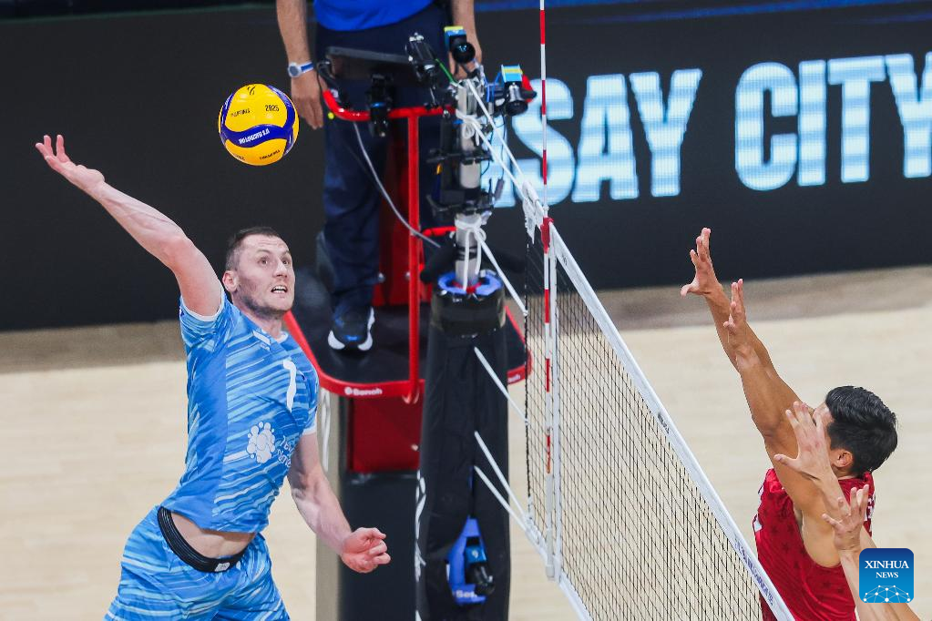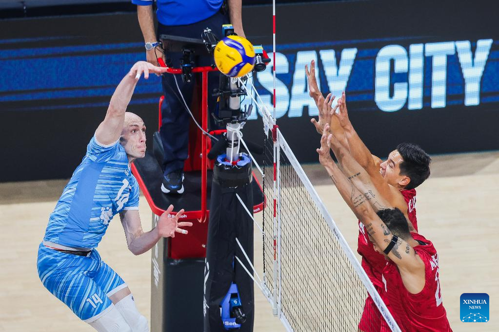 Players of Slovenia compete during the round of 16 match between the United States and Slovenia at the FIVB Men's World Championship 2025 in Pasay City, the Philippines, Sept. 22, 2025. (Xinhua/Rouelle Umali)