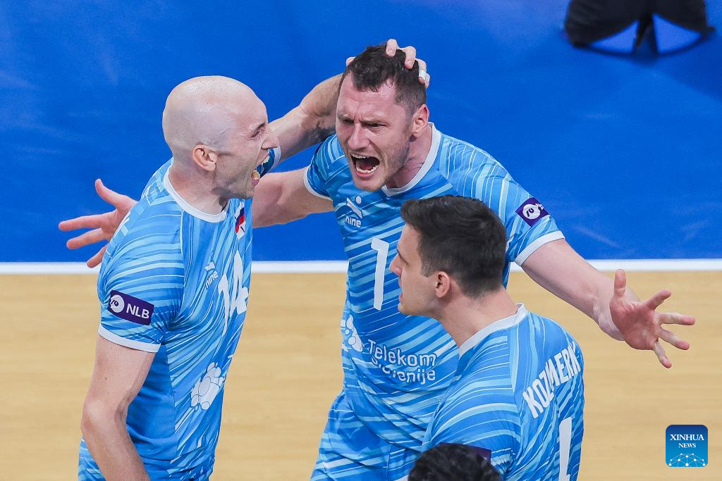 Players of the Slovenia celebrate after scoring a point during the round of 16 match between the United States and Slovenia at the FIVB Men's World Championship 2025 in Pasay City, the Philippines, Sept. 22, 2025. (Xinhua/Rouelle Umali)