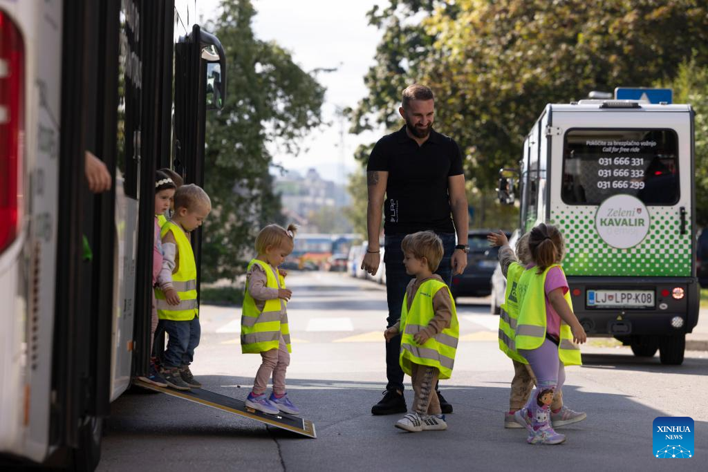 Children learn what they need to know as public transport passengers on World Car Free Day in Ljubljana, Slovenia, Sept. 22, 2025. (Photo by Zeljko Stevanic/Xinhua)