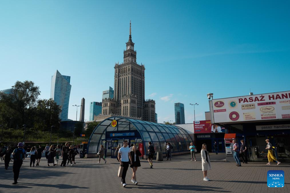 People walk near a central metro station with the Palace of Culture and Science in the background in Warsaw, Poland on Sept. 22, 2025. Public transportation in Warsaw was free of charge for all passengers on World Car Free Day, part of the European Mobility Week to promote sustainable urban mobility. (Photo by Jaap Arriens/Xinhua)