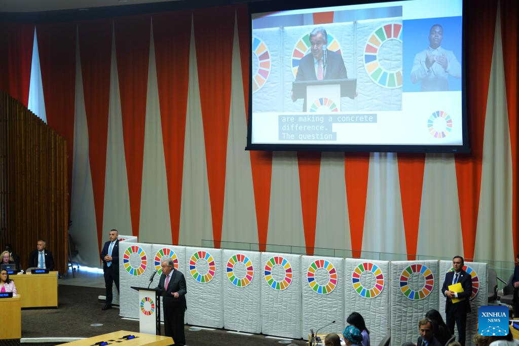 UNITED NATIONS, Sept. 22 (Xinhua) -- UN Secretary-General Antonio Guterres on Monday called for intensified efforts to achieve the Sustainable Development Goals (SDGs) at the SDG Moment event held at UN headquarters.