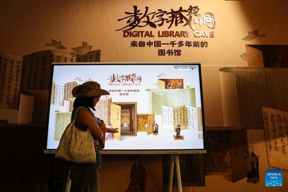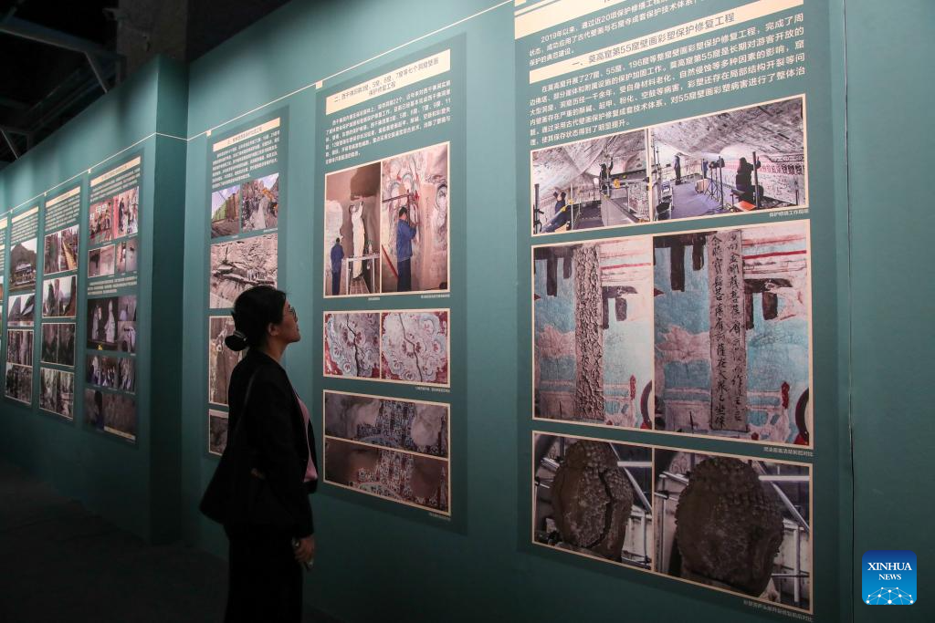 A visitor learns about the protection and restoration of the ancient murals of the Mogao Grottoes at an exhibition held by the Dunhuang Academy during the 8th Silk Road (Dunhuang) International Cultural Expo in Dunhuang, northwest China's Gansu Province, Sept. 22, 2025. More than 1,200 representatives from 97 countries and eight international organizations have gathered at the 8th Silk Road (Dunhuang) International Cultural Expo, which kicked off on Sunday in Dunhuang, a key hub on the ancient Silk Road in northwest China.