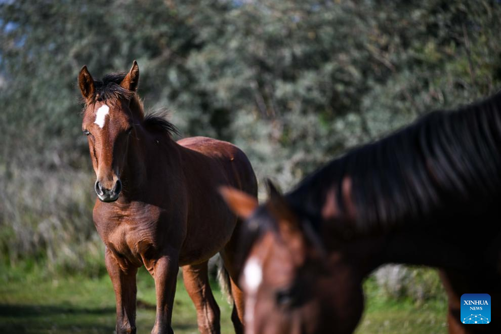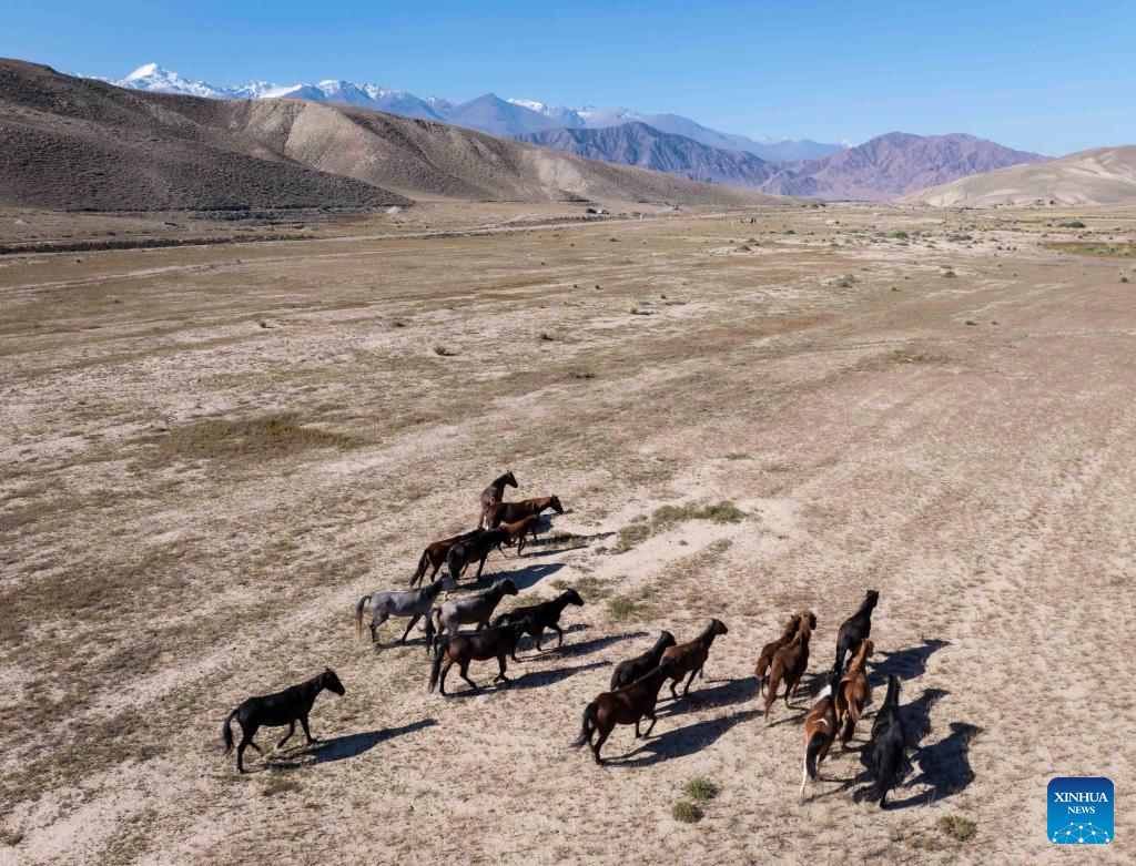 An aerial drone photo taken on Sept. 21, 2025 shows horses near the southern shore of Issyk-Kul Lake, Kyrgyzstan, on Sept. 21, 2025.