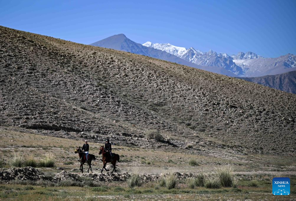 People ride horses at a village near the southern shore of Issyk-Kul Lake, Kyrgyzstan, on Sept. 21, 2025.