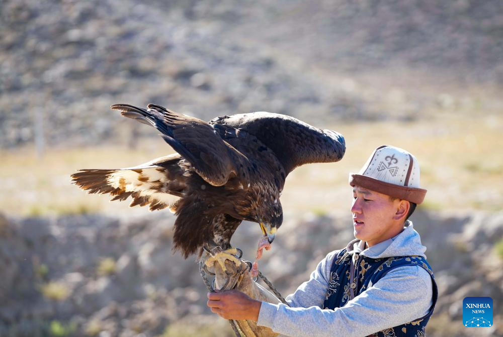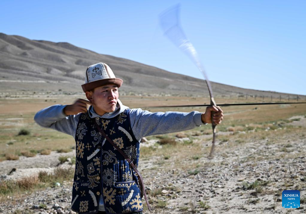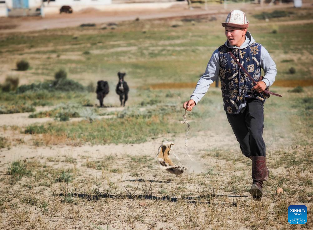 A hunter performs hunting skills at a village near the southern shore of Issyk-Kul Lake, Kyrgyzstan, on Sept. 21, 2025.