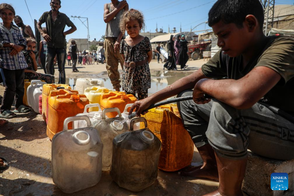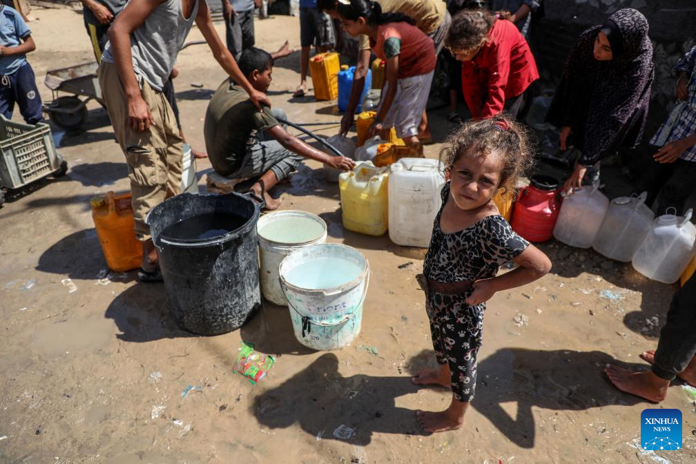 Displaced Palestinian children are seen fetching water at a temporary shelter in Deir al-Balah, in central Gaza Strip, Sept. 23, 2025. (Photo by Rizek Abdeljawad/Xinhua)