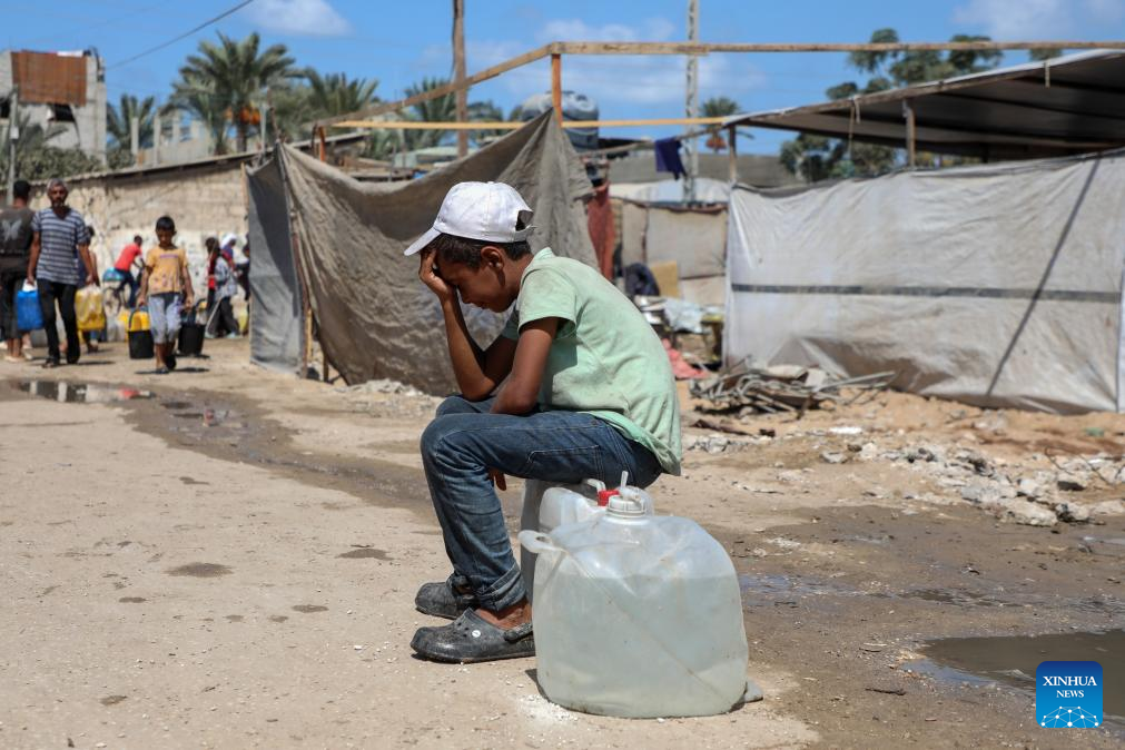 A displaced Palestinian child is seen fetching water at a temporary shelter in Deir al-Balah, in central Gaza Strip, Sept. 23, 2025. (Photo by Rizek Abdeljawad/Xinhua)